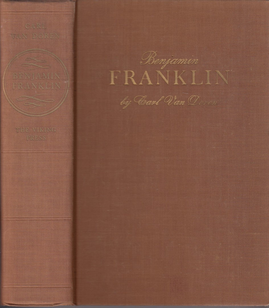 This classic, thorough book won the 1939 Pulitzer Prize for Biography. Van Doren relies heavily on Franklin's autobiography, papers, and letters, transcripts from papers and letters by Franklin contemporaries, and contemporaneous records from various institutions to create this work that is still considered an important critical biography. Originally published in October 1938; this is the fifth printing of that first edition from December 1938. No jacket. Book is tight, not bumped, very good in tan cloth. No staining or discoloration. Previous owner signature. No jacket. Viking Press. New York. 1938. Hb. USED. $25.00